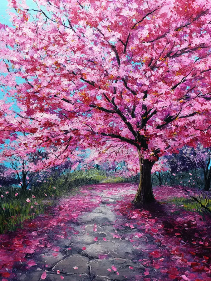 This acrylic painting shows a beautiful cherry blossom tree bursting with soft pink blooms above a quiet garden path. The branches spread wide across the canvas and create a canopy of layered petals in shades of rose, blush, and bright pink. Thick textured brush strokes give the blossoms a fluffy and lively look against the cool blue sky. A simple stone path curves gently beneath the tree while fallen petals scatter across the ground in vibrant pops of color. Soft greenery and distant trees add depth to the background and keep the focus on the glowing blossom canopy.