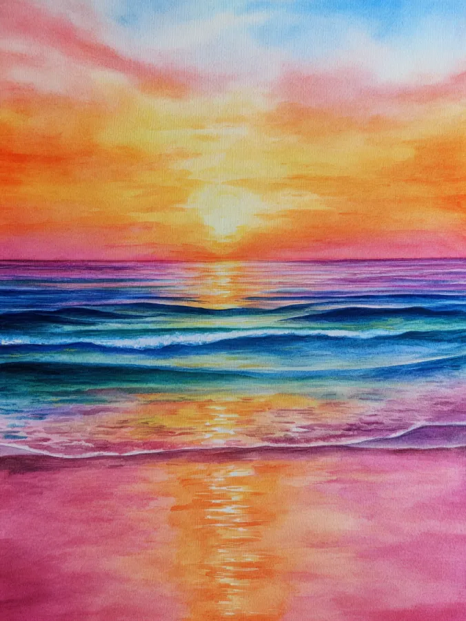 This watercolor canvas captures a glowing ocean sunset with layered waves rolling gently toward the shore and a radiant sun melting into the horizon. Warm oranges pinks and golden yellows blend smoothly across the sky while cool blues and teals ripple through the water below. The brushstrokes feel fluid and relaxed with soft transitions between colors that create a calm reflective surface. The vertical reflection of light pulls the eye downward and makes the whole composition feel balanced and peaceful.
