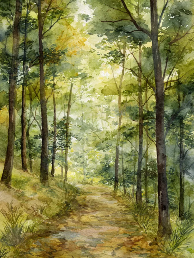 This watercolor canvas shows a peaceful woodland path winding through tall trees washed in layers of soft greens and warm golden light. The leaves feel airy and loose with gentle color variations that suggest sunlight filtering through the canopy. Brushstrokes stay relaxed and slightly textured which gives the scene a natural organic feel. The path leads the eye inward and creates a cozy sense of depth without feeling busy or overwhelming.