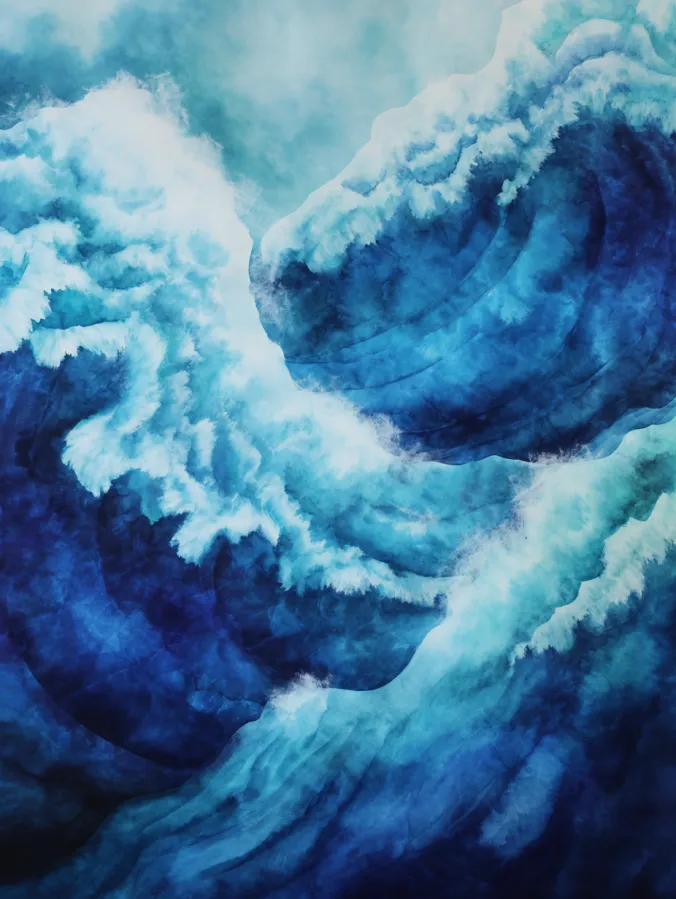 This watercolor canvas captures powerful ocean waves curling and folding into each other in rich shades of deep navy teal and soft seafoam. The brushstrokes feel bold and fluid with layered washes that create movement and depth throughout the piece. Lighter areas crash into darker sections which makes the waves feel alive and full of energy. The composition swirls inward and keeps your eye moving across the canvas in a really satisfying way.