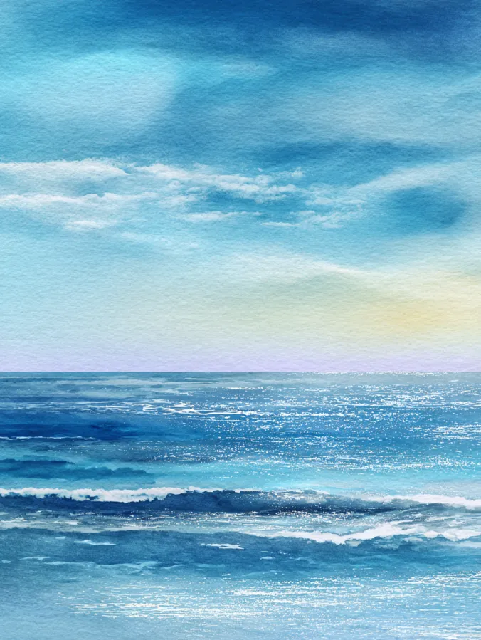 This watercolor canvas shows a peaceful ocean stretching toward a soft glowing horizon under a wide open sky. Cool blues and turquoise tones layer gently across the water with subtle white highlights that suggest small rolling waves. The sky fades smoothly from blue into warm pastel light near the horizon which adds a calm balanced feel. Brushstrokes stay loose and blended and the simple horizontal composition makes the scene feel open and relaxing.