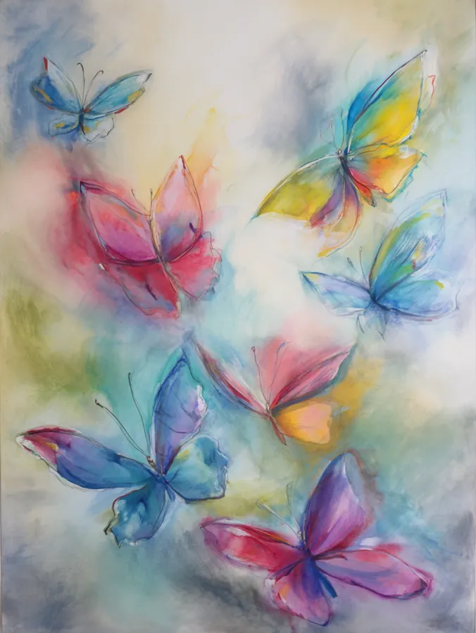 This watercolor canvas features a group of soft flowing butterflies drifting across a light dreamy background. Bright blues pinks yellows and purples blend gently within each wing and create a playful contrast against the muted backdrop. The brushstrokes feel loose and expressive with thin sketch like lines giving the butterflies movement and personality. The overall composition feels airy and balanced with each butterfly floating freely without feeling crowded.