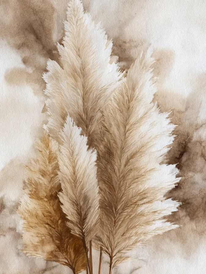 This watercolor canvas features tall pampas grass stems painted in warm beige cream and soft caramel tones. The feathery plumes are created with light flowing brushstrokes that give them a fluffy airy texture. The background stays muted and softly washed which helps the grasses stand out without feeling harsh. The composition feels calm and balanced with the stems gently rising upward and filling the space in a natural elegant way.