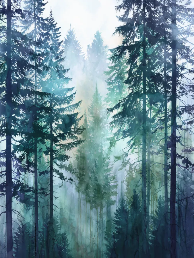 This watercolor canvas shows tall evergreen trees rising through soft layers of mist in cool greens blues and gentle teal tones. The trees in the foreground feel slightly darker and more defined while the background fades softly which creates beautiful depth. Brushstrokes stay loose and slightly textured giving the forest a dreamy atmospheric feel. The vertical composition draws your eye upward and makes the scene feel calm spacious and quietly dramatic.