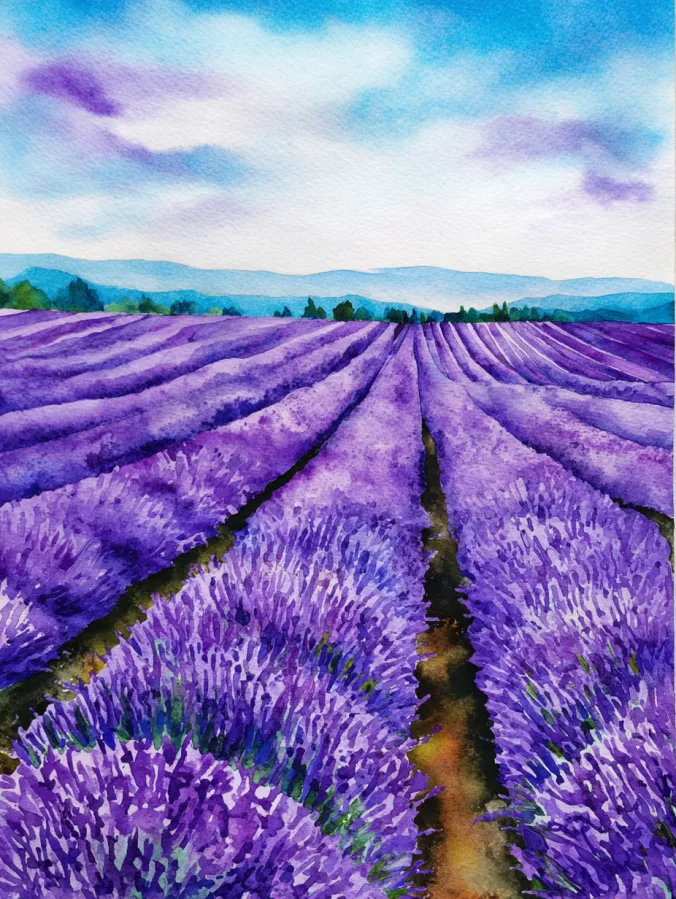 This watercolor canvas shows long rows of lavender stretching toward the horizon in rich shades of purple and violet. The brushstrokes are loose and textured which gives the flowers a soft fluffy look without needing tiny details. A narrow path runs through the center and pulls the eye forward while distant hills and a pale blue sky keep the background light and airy. The overall layout feels open balanced and full of gentle movement.