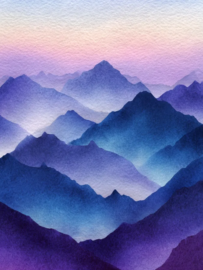 This watercolor canvas shows a peaceful range of layered mountains fading softly into the distance. Cool blues and purples blend smoothly from dark in the foreground to light and airy in the background. The brushstrokes feel gentle and washed out which creates a dreamy mist effect between each ridge. The pastel sky above adds warmth and balance and helps the whole piece feel calm and spacious without feeling empty.