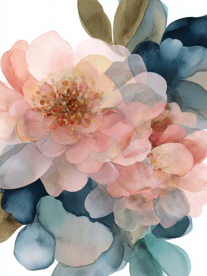 This watercolor canvas features layered flowers with translucent petals that softly overlap and blend into one another. Blush pinks and warm peach tones mix beautifully with muted blues greens and earthy neutrals. The brushstrokes are loose and fluid which gives the petals a delicate almost floating look. The composition feels full and balanced without being crowded and the transparent layers create a gentle sense of depth that makes the florals feel airy and elegant.