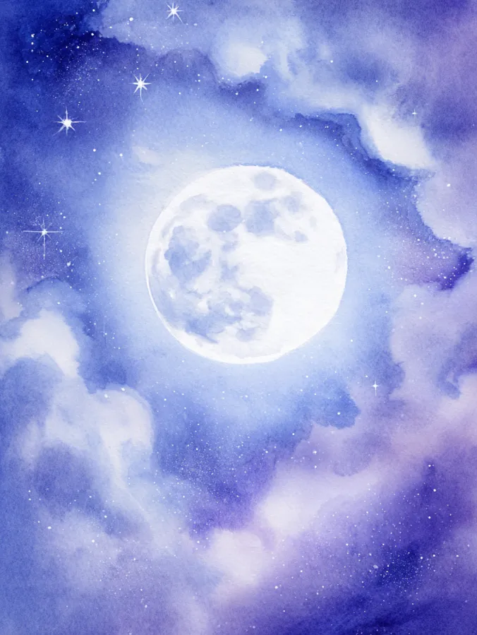 This watercolor canvas shows a glowing full moon surrounded by soft clouds and scattered stars floating through a deep blue and violet night sky. The colors blend gently with smooth washes that fade from light around the moon into richer tones toward the edges. Brushstrokes feel airy and loose which gives the clouds a misty almost magical look. The moon sits calmly at the center and naturally draws the eye while the surrounding sky adds movement and quiet drama.