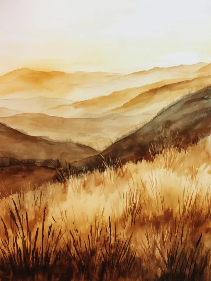 This watercolor canvas shows rolling hills bathed in warm golden light with soft layers fading gently into the distance. Rich ochre browns and honey yellows blend smoothly with lighter washes that suggest early morning haze. The foreground grasses are painted with loose expressive strokes that add texture and movement while the distant hills stay soft and dreamy. The composition leads the eye naturally across the scene and feels open and peaceful without being overly detailed.