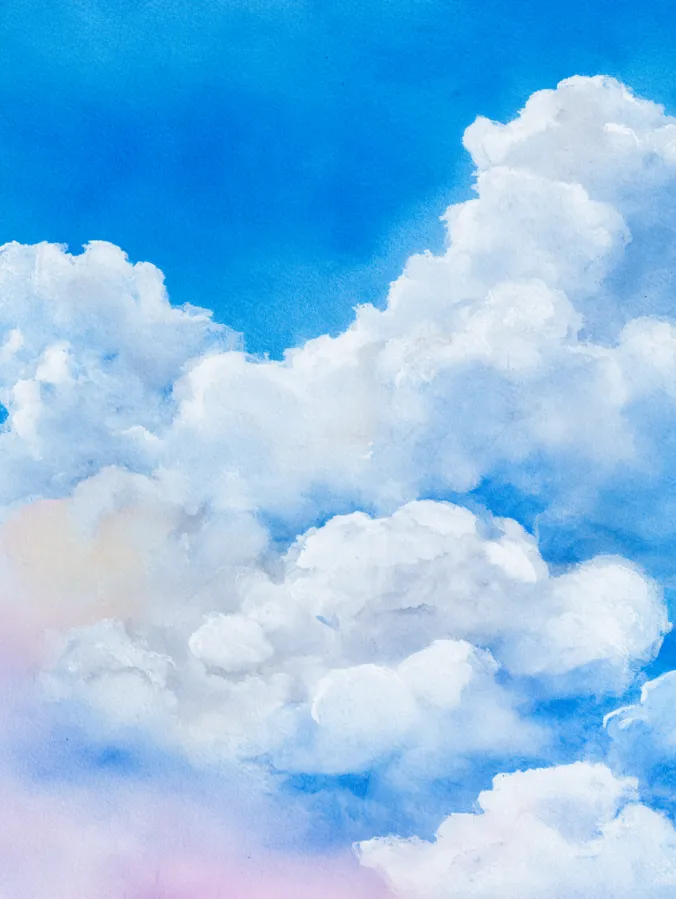 This watercolor canvas captures a cheerful sky filled with soft fluffy clouds drifting across a rich blue background. The whites and pale creams blend gently into the blue which gives the clouds a light airy feel. The brushstrokes are loose and layered so the clouds feel full without looking heavy. The composition keeps things simple and open which makes the whole painting feel fresh and uplifting.