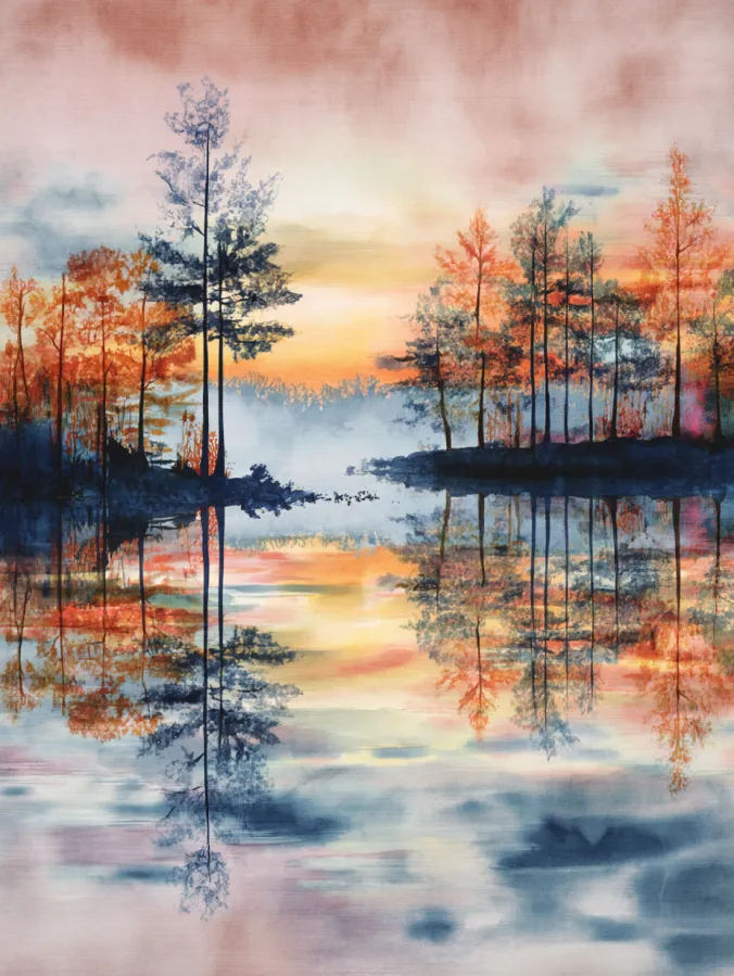 This watercolor canvas shows a calm lake surrounded by tall autumn trees glowing in warm oranges soft reds and muted blues. The sky melts gently into the water below creating a mirror like reflection that feels smooth and dreamy. Brushstrokes stay loose and slightly blurred which adds to the misty atmosphere and keeps the scene feeling soft rather than detailed. The composition feels balanced with trees framing both sides and the glowing center pulling everything together.
