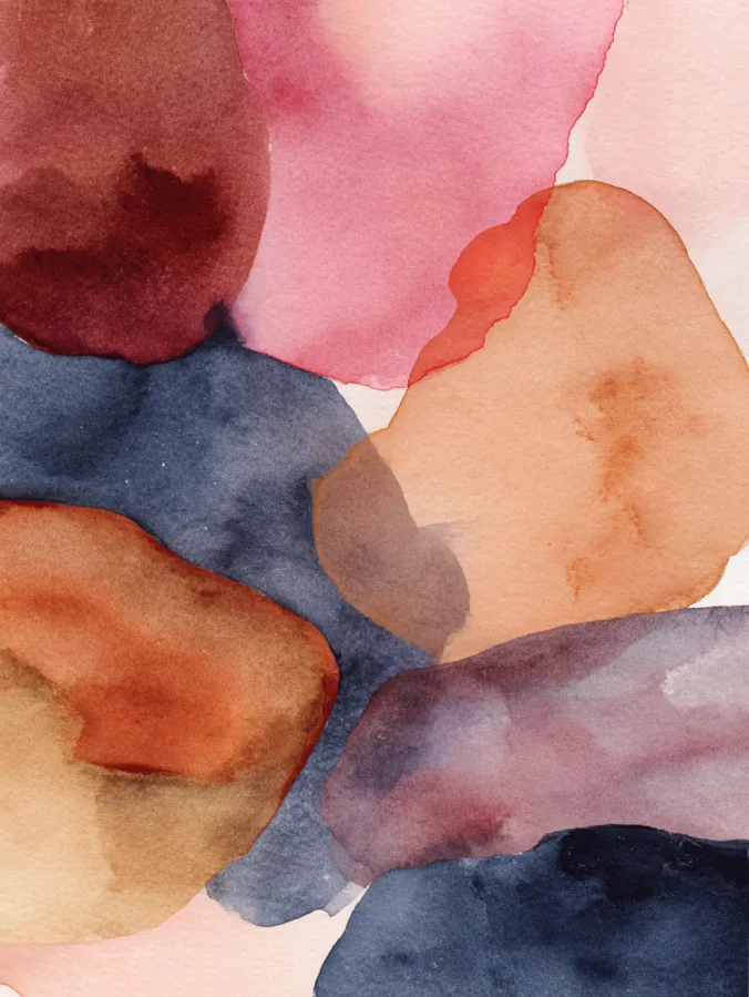 This watercolor canvas features overlapping organic shapes painted in warm earthy tones mixed with soft pinks and deep blue grays. The colors blend gently where the shapes meet which creates a calm layered effect without hard edges. Brushstrokes feel loose and natural with visible watercolor blooms that add texture and interest. The overall layout feels modern and balanced while still keeping that relaxed hand painted look.