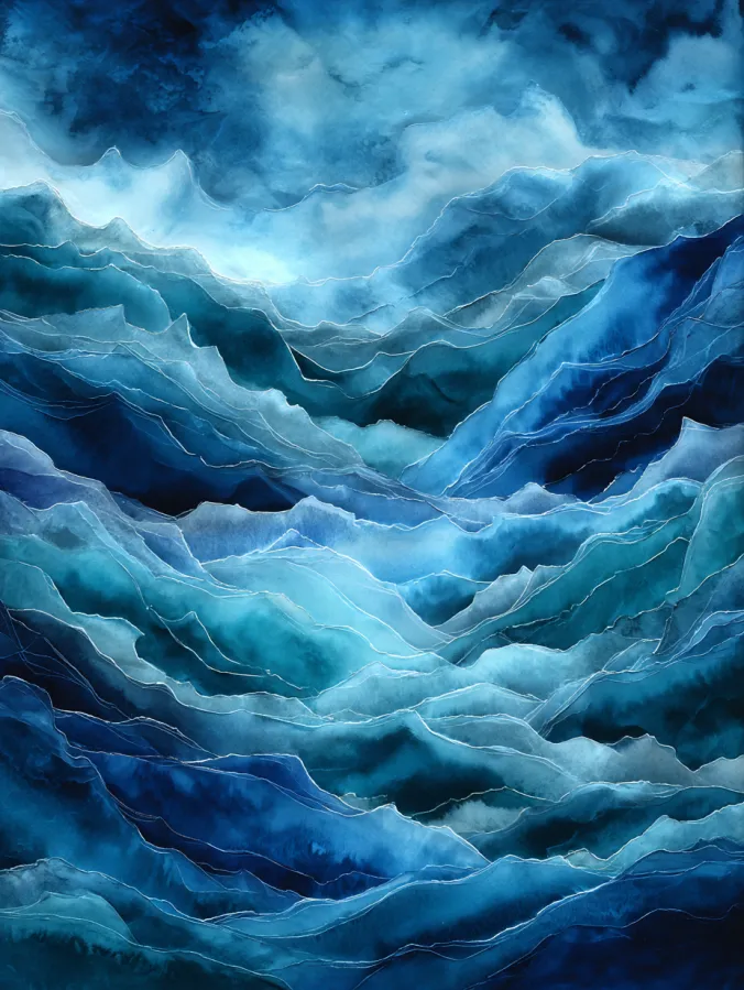 This watercolor painting is made up of layered wave like shapes in shades of teal, aqua, navy, and soft icy blue. The colors flow into each other with gentle transitions, creating a sense of movement across the entire page. Thin lighter lines define the edges of each layer, adding structure without making the piece feel stiff. The composition fills the frame completely, pulling your eye from one curve to the next and giving the whole painting a calm rhythmic energy.