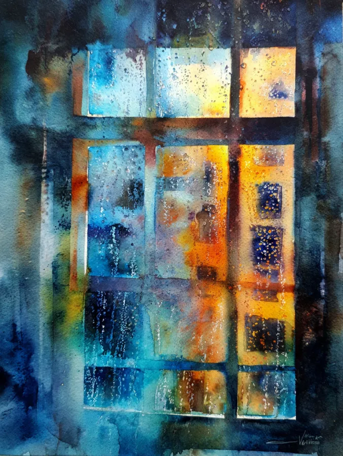 This watercolor painting captures the cozy feeling of looking through a rain covered window at glowing light beyond. Cool blues and deep teal tones frame the scene, while warm yellows and soft orange squares shine through the window panes. Loose washes and soft vertical blends mimic rain streaks running down the glass, giving the painting a moody and atmospheric feel. The composition stays simple and graphic, with the window grid creating structure while the colors keep everything loose and expressive.
