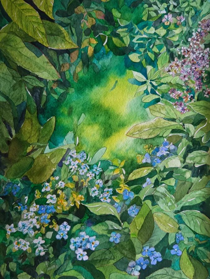 This watercolor painting feels like peeking into a secret garden, with layered green leaves wrapping gently around a glowing open center. The foliage is painted in rich emerald, olive, and soft moss tones, while delicate blue and pink flowers are tucked throughout for pops of color. Brush strokes stay loose but intentional, letting shapes overlap naturally and creating depth without harsh lines. The open center acts like a soft focal point, making the whole composition feel balanced, airy, and inviting.