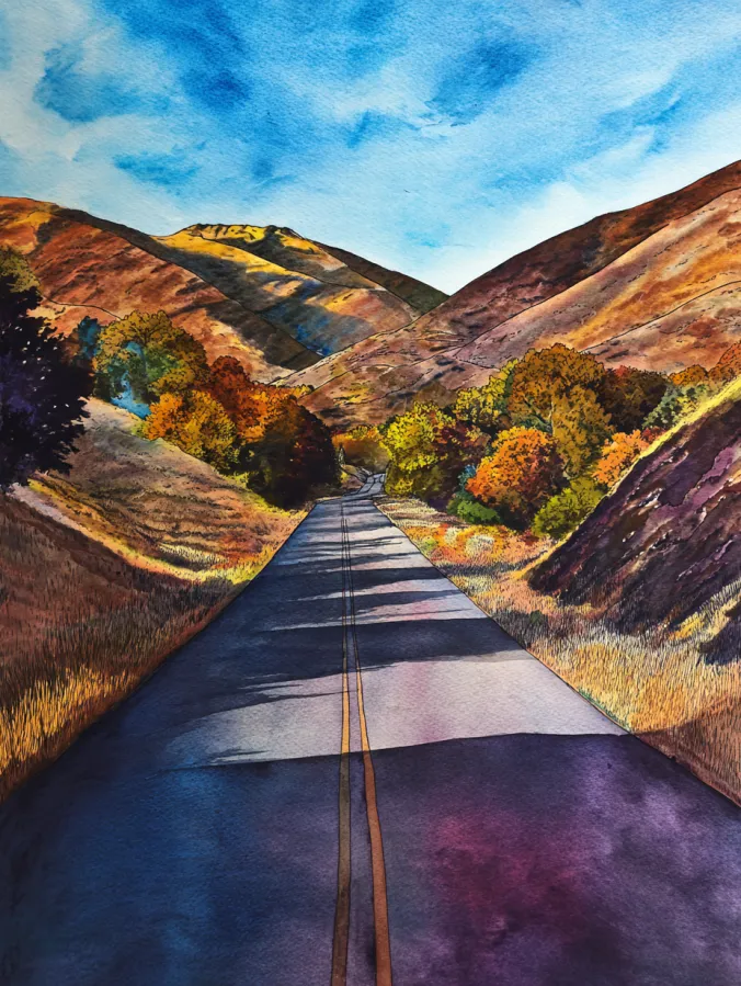 This watercolor painting shows a quiet road stretching forward between warm autumn hills, with golden trees lining the path and soft mountains rising in the distance. Rich browns, rust, ochre, and deep green blend beautifully with cooler blues in the sky, creating a strong sense of depth. The brush strokes feel confident but relaxed, especially in the hills where layered washes add texture without overworking the details. The road leads the eye straight into the scene, giving the whole composition a peaceful and slightly adventurous feel.