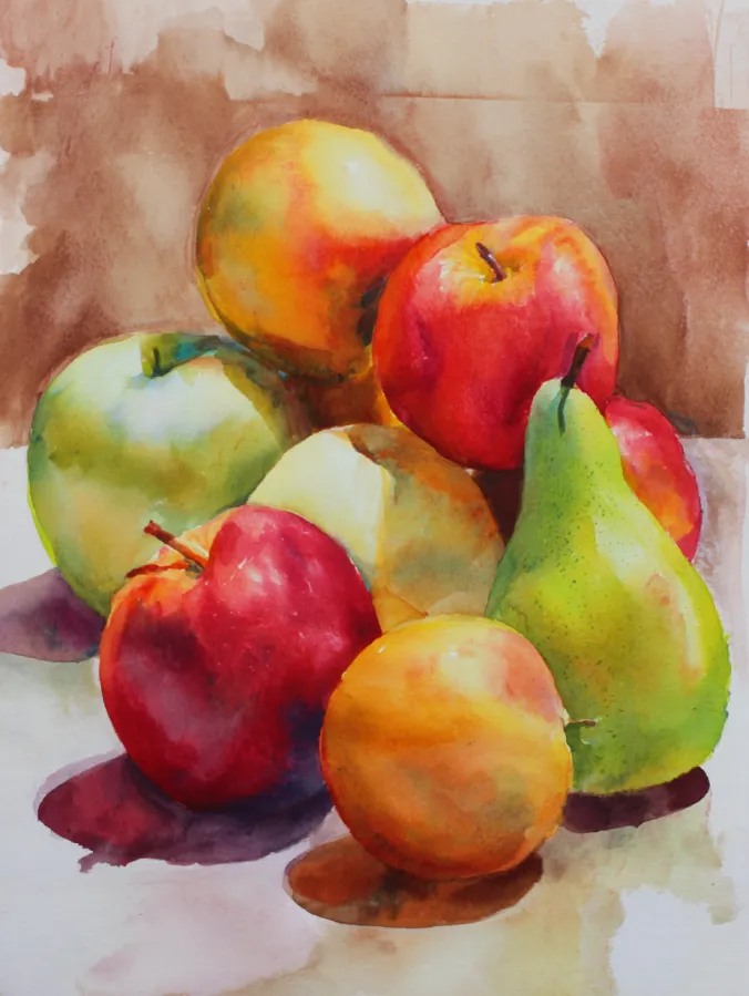 This watercolor painting shows a casual arrangement of apples pears and citrus fruits painted in warm reds golden yellows and soft greens. The shapes feel rounded and natural with gentle highlights that give each fruit a sense of weight and form. Brush strokes are loose but intentional especially where colors blend softly to suggest light and shadow. The background stays muted and simple which helps the fruit stand out and keeps the overall layout calm and balanced.