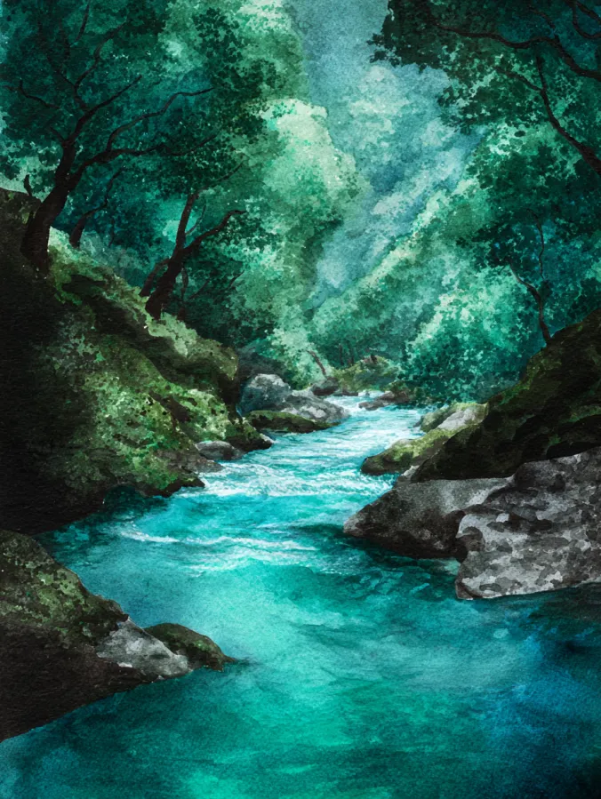 This watercolor painting shows a clear turquoise stream winding through a lush forest filled with deep greens and soft shadowy blues. The water feels bright and alive as it flows between mossy rocks, while tall trees frame the scene and guide your eye toward the gentle curve of the stream. Brush strokes are loose and textured in the foliage, creating depth without sharp detail, while the water stays smoother with soft highlights that suggest movement. The composition feels immersive and calm, like stepping into a cool shaded forest on a quiet day.