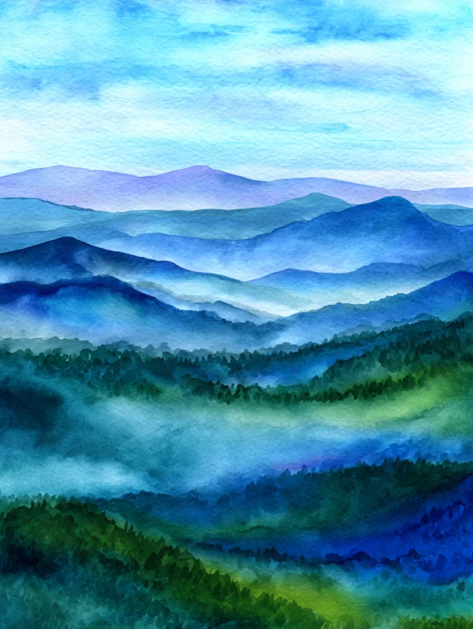 This watercolor painting features softly stacked mountain ridges fading into the distance, painted in calming shades of blue, teal, and gentle green. Each layer feels lighter and more transparent as it moves upward, creating a peaceful sense of depth without sharp lines or heavy contrast. The brush strokes are loose and fluid, especially in the misty areas where colors blend effortlessly into one another. The sky stays light and airy, letting the layered hills take center stage and giving the whole piece a quiet, dreamy flow from bottom to top.