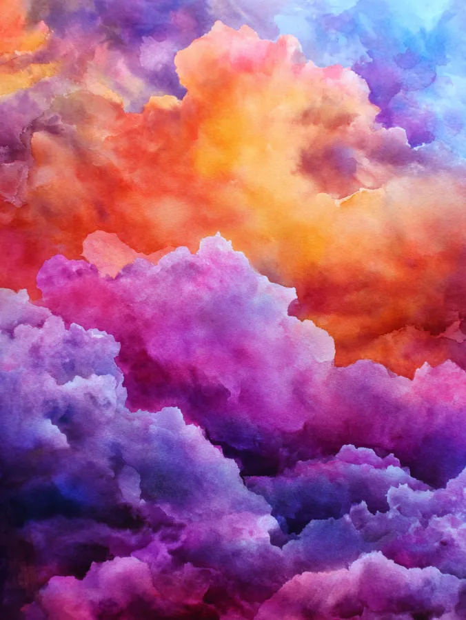 This watercolor painting is filled with soft billowing clouds painted in rich purples warm coral glowing orange and gentle hints of blue. The colors blend smoothly into one another with fluffy cloud edges that feel airy and light rather than sharp. Brush strokes stay loose and layered which gives the whole piece a sense of movement and depth. The composition feels immersive as the clouds fill the entire frame and pull your eye through waves of color and softness.