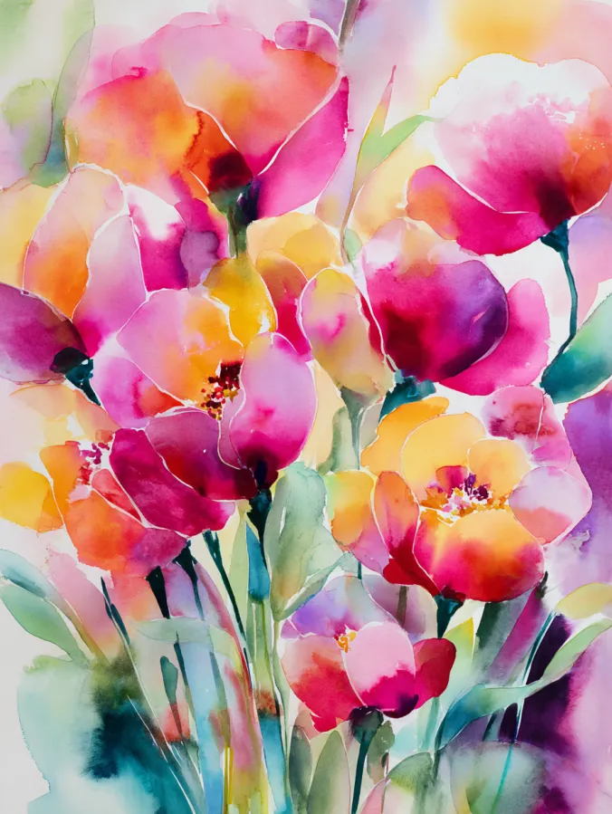 This watercolor design is full of bright, joyful blooms painted in flowing layers of pink, coral, yellow, and soft orange. The petals blend into each other with gentle transitions, creating that dreamy watercolor glow without sharp edges or heavy outlines. Stems and leaves appear in fresh greens and teal tones, loosely brushed to keep the focus on the flowers. The composition feels lively but balanced, with blooms overlapping naturally and filling the space in a way that feels organic and light rather than crowded.