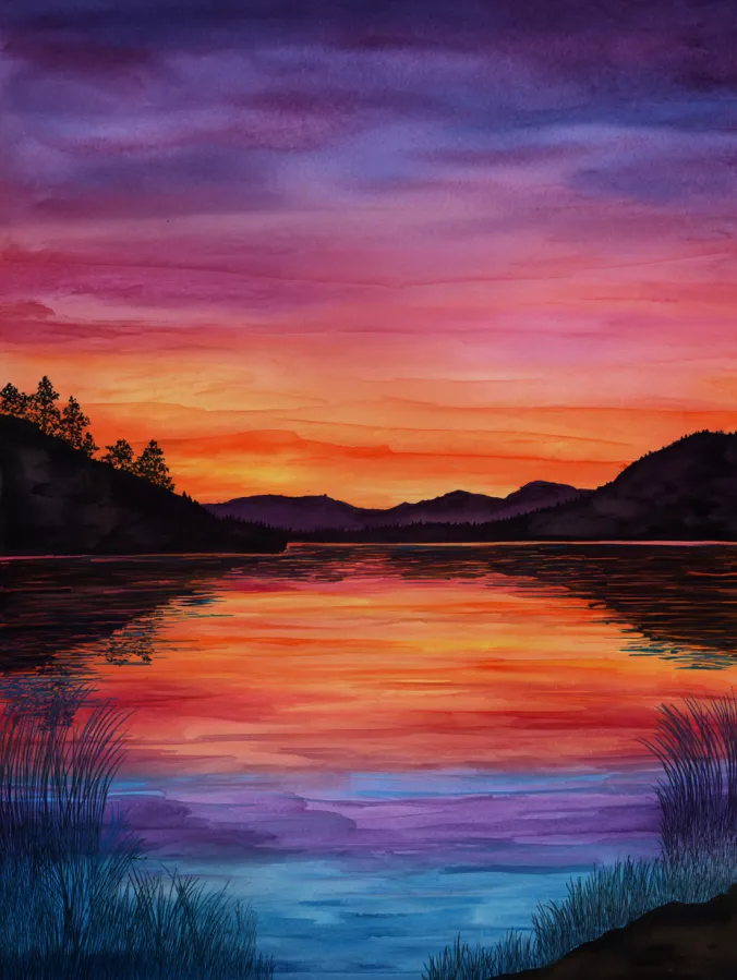 This watercolor painting captures a glowing sunset reflected across a calm lake, with rich layers of orange, pink, purple, and deep blue flowing from sky to water. The horizon sits gently in the center, framed by dark hill silhouettes that keep the bold colors feeling grounded. Brush strokes stay soft and horizontal, especially in the water where blended reflections mirror the sky in a slightly blurred way. The overall layout feels balanced and soothing, with darker edges pulling your eyes toward the warm glowing center.