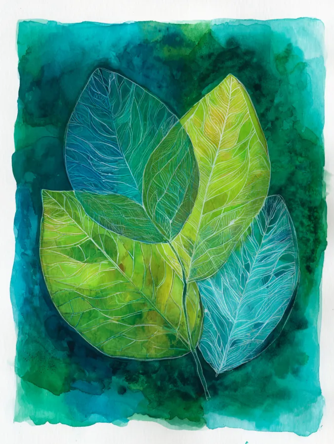This watercolor design features a cluster of overlapping leaves painted in rich greens, teal, and soft blue tones, all set against a deep, textured background. Each leaf has delicate vein details that stand out beautifully against the smooth washes beneath them. The brush strokes feel controlled but relaxed, with gentle gradients that give the leaves dimension without looking stiff. The composition stays centered and balanced, letting the layered shapes and contrasting colors create visual interest in a clean and calming way.