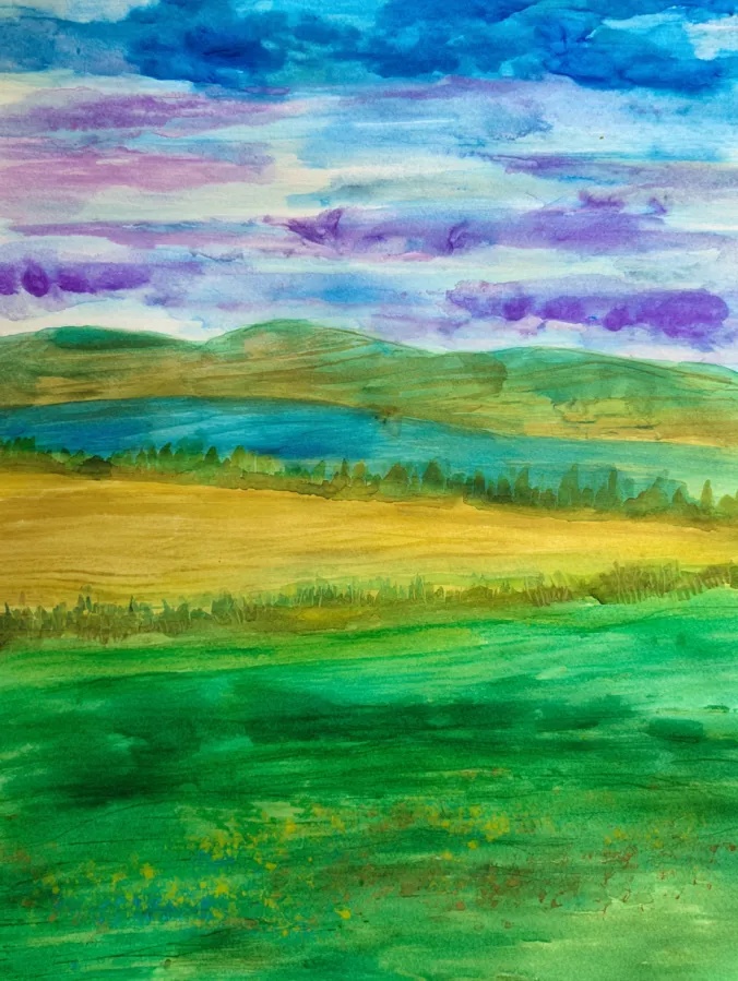This watercolor painting shows wide open fields layered in fresh greens and warm golden tones, stretching toward gentle hills in the distance. The sky above is painted in soft blues and lavender with loose horizontal brush strokes that keep it light and airy. Colors blend smoothly from one band to the next, creating a calm sense of depth without sharp edges or heavy detail. The overall layout feels open and balanced, with the land taking up most of the space and the sky softly framing the scene.