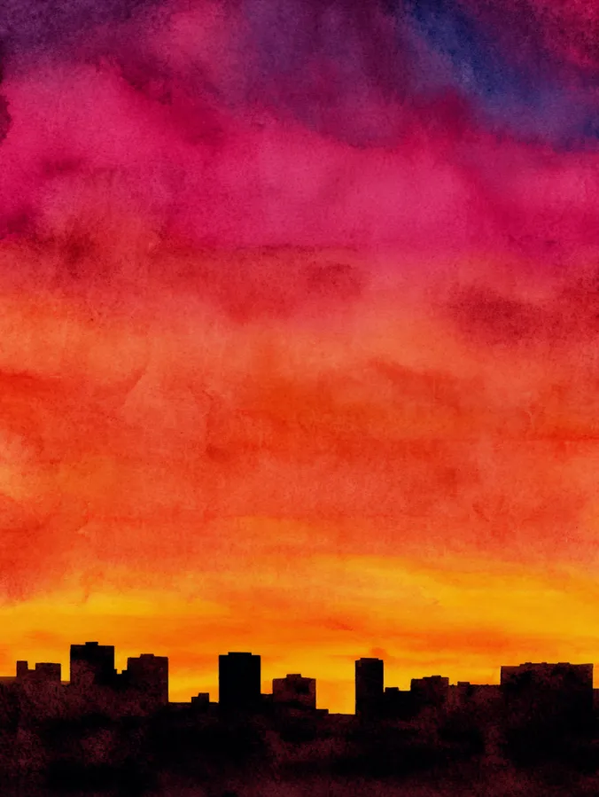 This watercolor painting features a dramatic sunset sky bursting with deep reds, warm oranges, and hints of magenta fading upward into darker tones. The city skyline sits low and dark along the bottom, painted as simple silhouettes that contrast strongly against the glowing sky. Brush strokes in the sky feel loose and layered, with soft blends and natural texture showing through the paper. The composition keeps things simple but powerful, letting the intense color gradient steal the spotlight while the skyline anchors the scene.