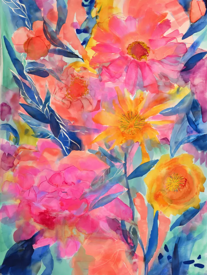 This watercolor design is bursting with oversized flowers in lively pinks, corals, sunny yellows, and soft peach tones, all layered together in a playful, flowing composition. The brush strokes feel loose and confident, with petals bleeding gently into one another and leaves painted in deep blues and teals for contrast. Everything overlaps in a way that feels natural and breezy, like a garden in full bloom after a warm rain. The background blends seamlessly into the florals, keeping the whole piece vibrant and full without feeling crowded.