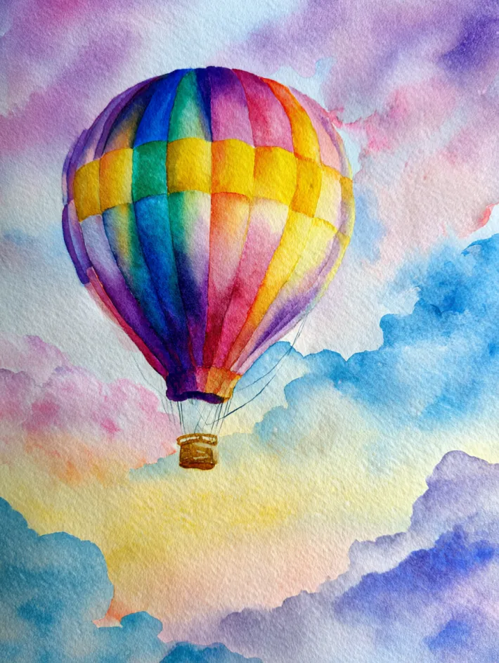 This watercolor design shows a cheerful hot air balloon floating through a soft pastel sky filled with layered clouds. The balloon is painted in bright rainbow sections with smooth blends of pink, yellow, blue, green, and purple that feel vibrant without being harsh. Loose brush strokes and gentle shading give the balloon a rounded shape while keeping the overall style light and playful. The clouds fade in and out around it, creating a dreamy sense of movement and space that feels open and uplifting.