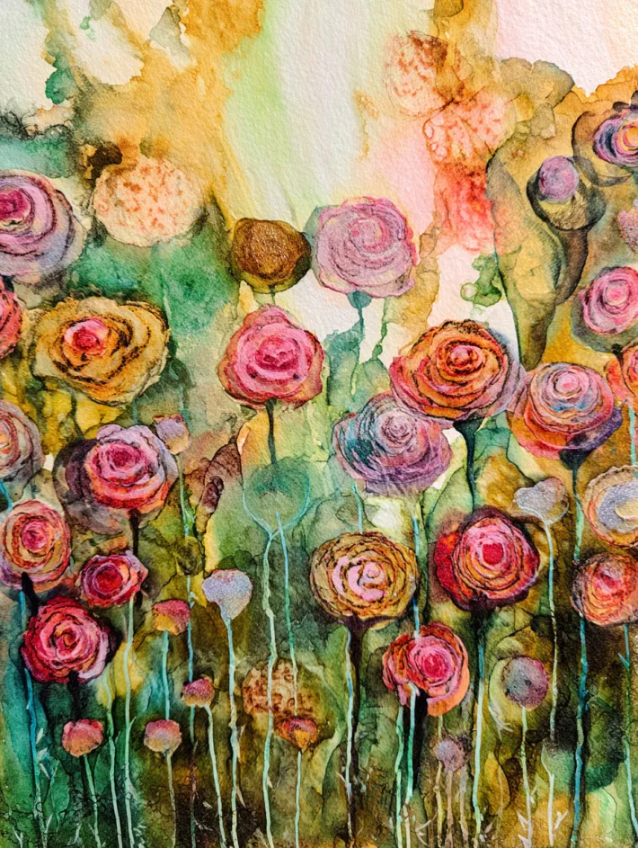 This watercolor design is filled with whimsical flower shapes rising on thin stems, painted in rich pinks, warm corals, soft purples, and earthy greens. The blooms have a loose spiral style with layered rings of color that bleed gently into one another. Washes of yellow, olive, and mossy green flow through the background, creating a lively garden feel without sharp edges. Drips and splashes add movement and texture, making the whole composition feel expressive and full of energy while still staying light and organic.