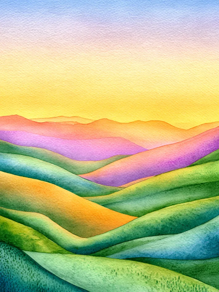 This watercolor design shows soft rolling hills layered across the page in gentle waves of green, teal, purple, peach, and sunny yellow. The brush strokes are smooth and even, creating clean curves that flow naturally from the foreground into the distance. Each hill overlaps the next with subtle shading that adds depth without feeling heavy. The sky fades from warm golden tones into soft blue, giving the whole composition a calm and cheerful glow.