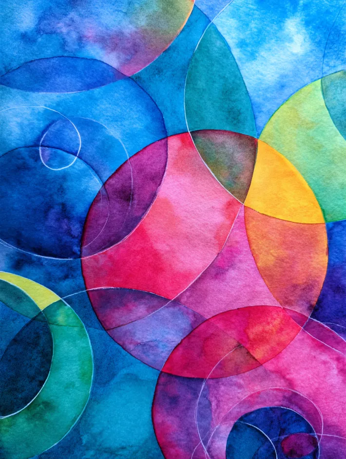 This watercolor design features overlapping circles and curved lines layered across the page in bold shades of blue, teal, pink, red, yellow, and purple. The brush strokes are soft and blended, allowing the colors to mix naturally where the shapes intersect. Faint line details trace some of the curves, adding structure without overpowering the loose watercolor feel. The composition feels balanced and energetic, with each circle flowing into the next to create movement and depth across the entire painting.