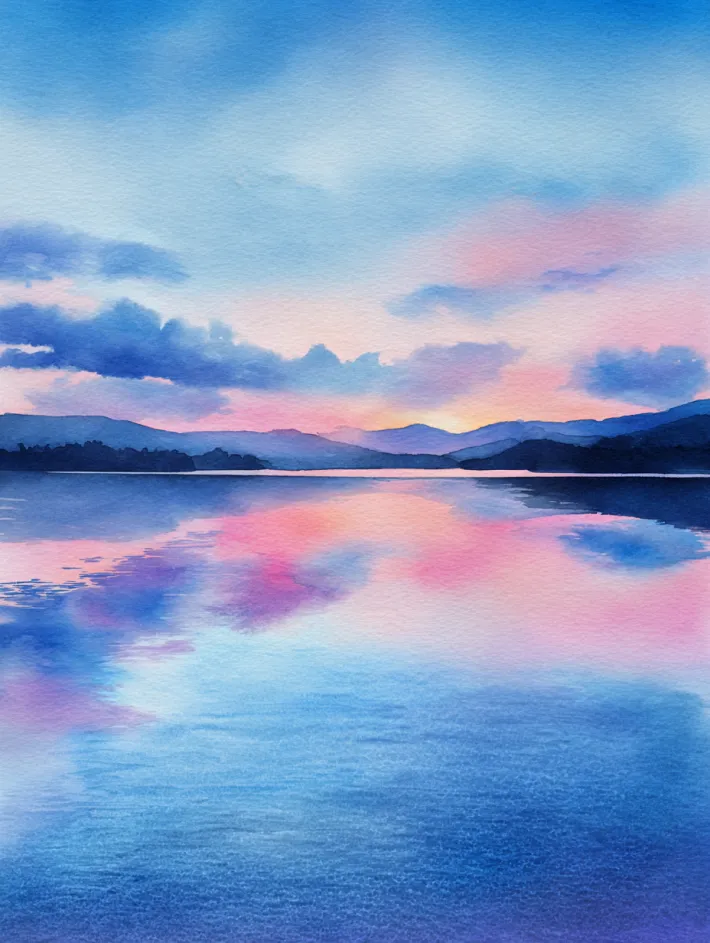 This watercolor design captures a peaceful lake reflecting a soft sunset sky in gentle blues, blush pinks, and warm peach tones. The brush strokes are smooth and layered, allowing the colors in the sky to melt naturally into the water below. Distant hills sit quietly along the horizon, painted in deeper blues to frame the glowing center. The reflection mirrors the sky with subtle ripples, giving the whole composition a balanced and calming flow from top to bottom.