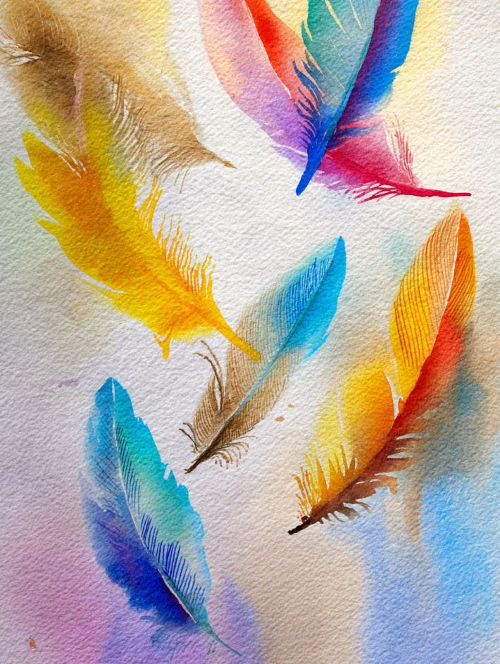 This watercolor design features delicate feathers drifting across the page in vibrant shades of turquoise, golden yellow, coral, pink, and soft brown. The brush strokes are light and fluid, allowing the feather shapes to feel airy and weightless. Fine details suggest soft texture without feeling stiff, while gentle washes in the background add depth without taking attention away from the feathers. The layout feels balanced and playful, with each feather floating freely in its own space.