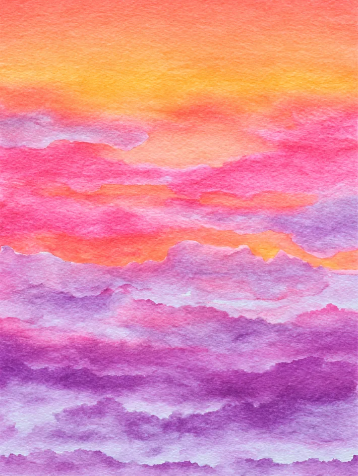 This watercolor design is made up of soft layered washes in glowing shades of coral, peach, golden yellow, and gentle purple. The brush strokes are loose and horizontal, letting the colors blend smoothly into one another with soft edges that feel calm and natural. Each layer overlaps slightly, creating depth while keeping the overall composition simple and open. The texture of the paper adds a cozy handmade feel, making the colors look warm and inviting.