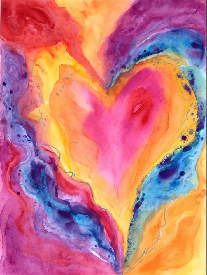 This watercolor design centers around a loose heart shape formed by flowing layers of pink, coral, golden yellow, and soft orange, surrounded by swirls of purple and blue. The brush strokes feel organic and free, with colors bleeding into one another in a way that looks natural and emotional. Thin lines and subtle texture add movement around the edges, while the heart stays softly defined without sharp outlines. The composition fills the page with energy and warmth, making it feel bold yet comforting.