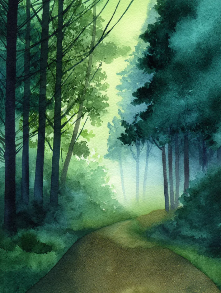 This watercolor design shows a quiet forest path winding gently through tall trees painted in layered greens, deep teal, and soft mossy tones. The brush strokes are loose and textured, especially in the foliage, which creates a misty and slightly dreamy feel. Light filters through the center of the scene, drawing the eye down the path and adding depth without sharp details. The darker trees on each side frame the lighter background beautifully, making the whole composition feel calm and inviting.
