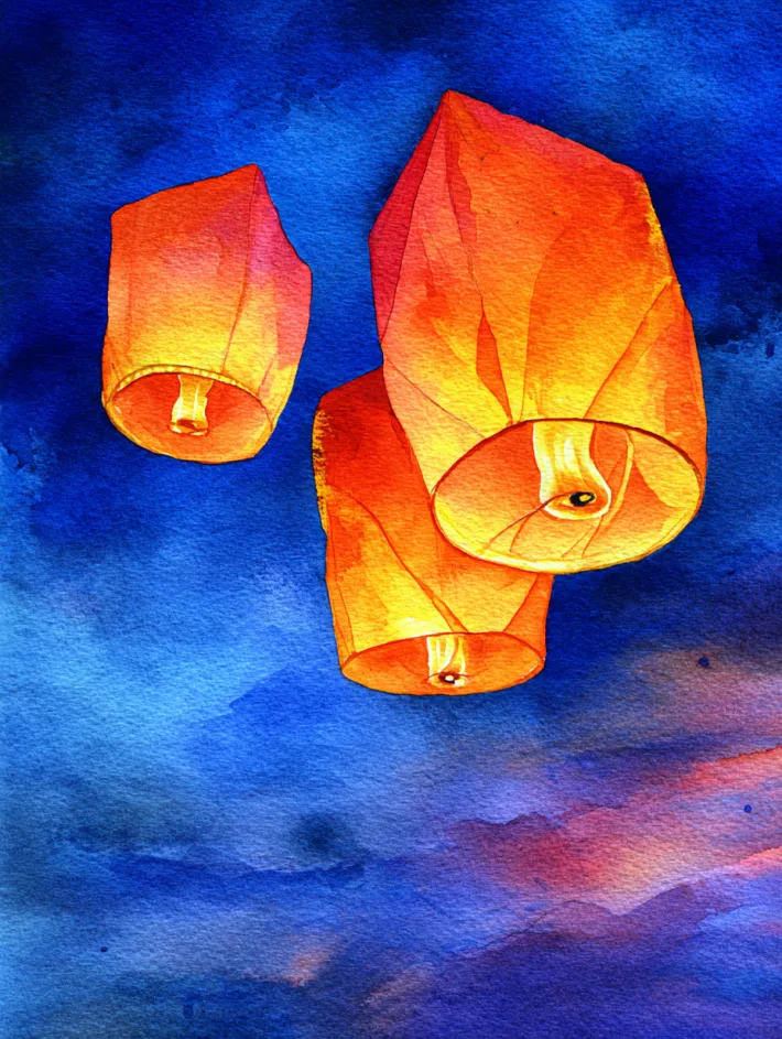 This watercolor design shows warm glowing sky lanterns floating gently against a deep blue night sky. The lanterns are painted in rich shades of orange and gold, with soft highlights that make them feel lit from within. Loose brush strokes and blended washes in the background create a dreamy sky with subtle hints of purple and pink. The composition feels light and uplifting, with the lanterns drifting upward and leaving plenty of open space for the eye to wander.