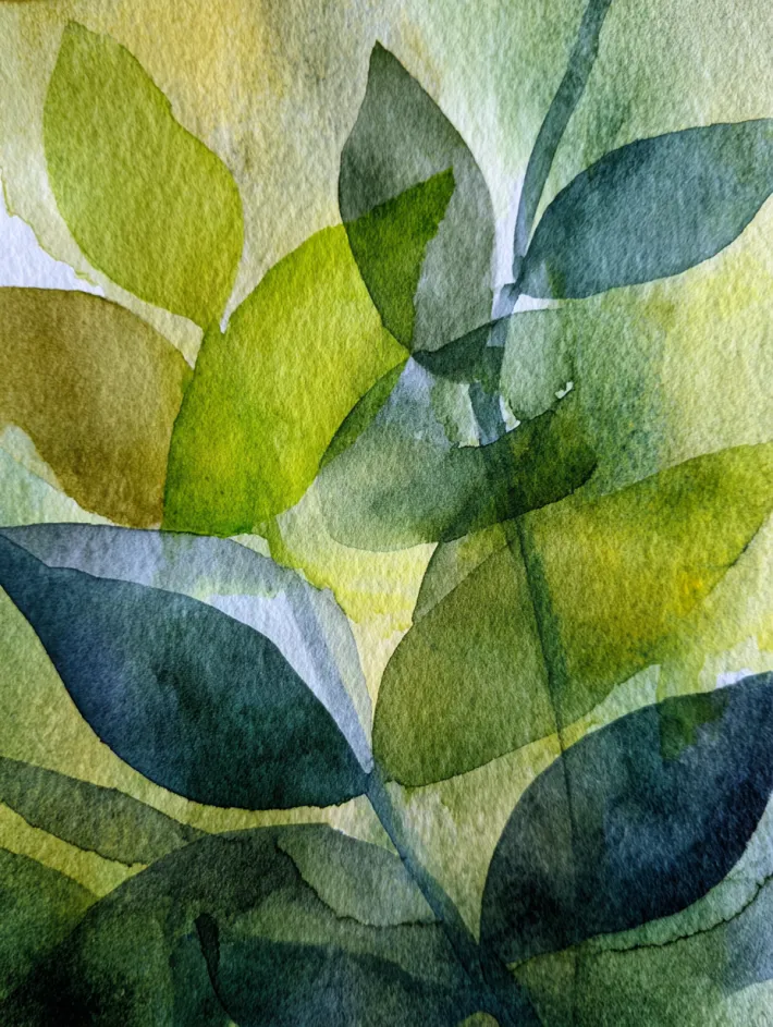 This watercolor design features overlapping leaf shapes painted in rich greens, olive tones, and muted teal with soft washes layered on top of one another. The brush strokes are loose and fluid, letting the colors blend naturally where the leaves intersect. Transparency plays a big role here, creating depth through overlapping shapes rather than sharp outlines. The background stays softly textured, allowing the organic forms to feel calm, balanced, and gently connected across the page.