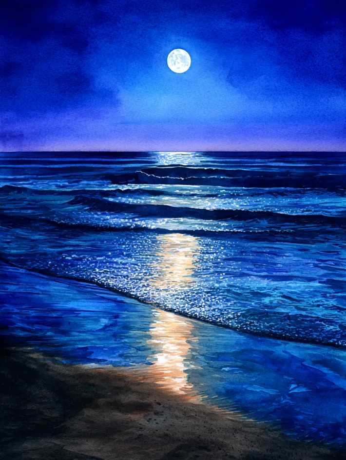 This watercolor design captures a glowing full moon hovering above a calm ocean, painted in deep blues and rich indigo tones. Soft layered brush strokes shape the waves, while lighter highlights shimmer across the water to reflect the moonlight. The reflection stretches from the horizon down toward the shore, creating a natural focal point that draws the eye through the composition. The shoreline stays dark and simple, grounding the scene and letting the luminous water take center stage.
