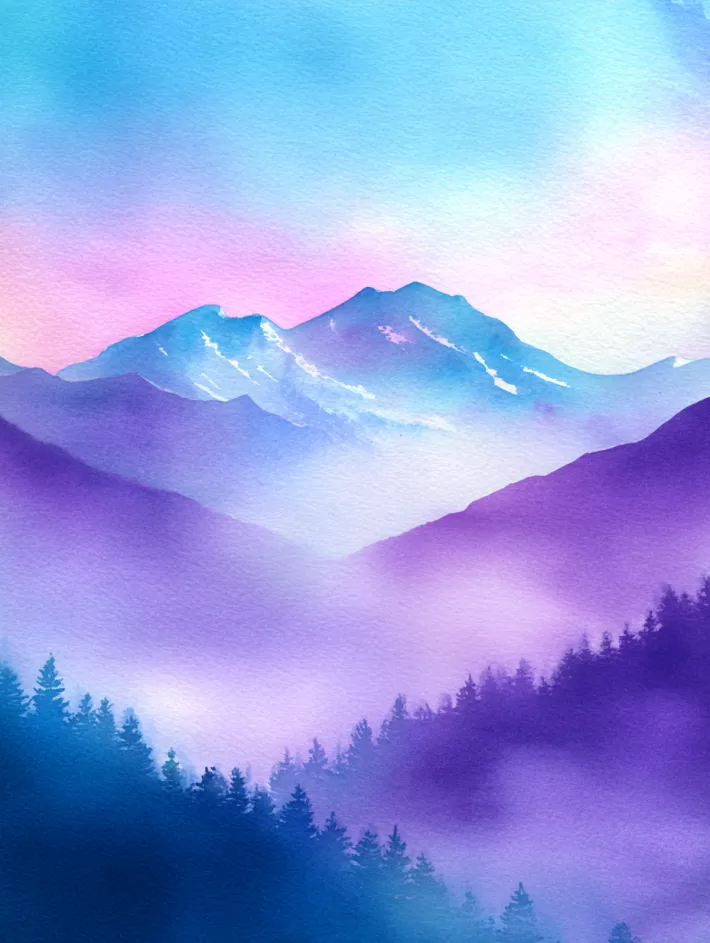 This watercolor design features soft layered mountains fading into one another with gentle washes of lavender, blue, and blush pink. The brush strokes are smooth and airy, creating a misty effect that feels calm and spacious. Darker tree silhouettes anchor the foreground while lighter mountain shapes drift into the distance, giving the whole piece a lovely sense of depth without feeling complicated. The sky blends seamlessly into the peaks, making the entire layout feel balanced and soothing.