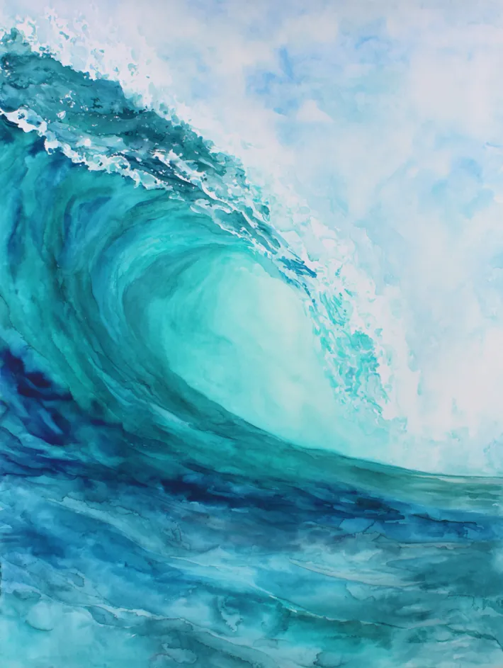 This watercolor design captures a powerful curling wave painted in rich shades of turquoise, teal, and deep ocean blue. The brush strokes sweep in curved motions that guide the eye straight into the heart of the wave, creating a beautiful sense of movement. Lighter washes and soft splashes suggest sea foam while deeper tones anchor the base, making the whole composition feel dynamic yet balanced. The background stays airy and light, letting the wave remain the star of the scene without feeling heavy.