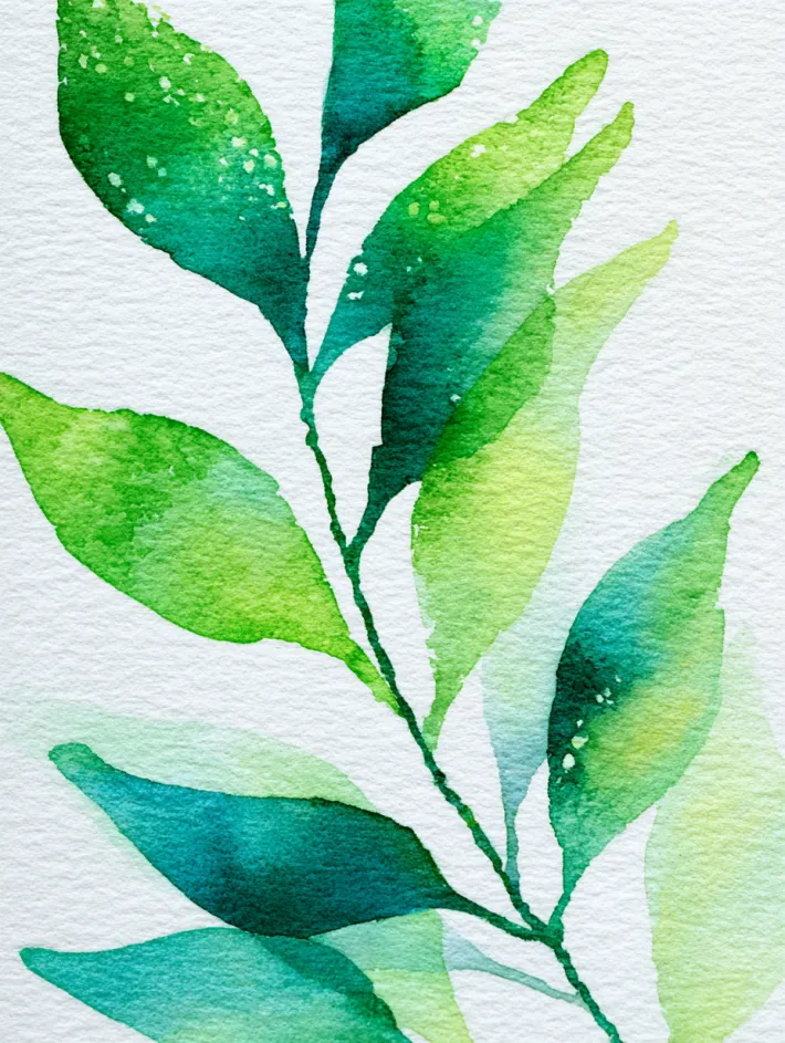 This watercolor design features a graceful stem with layered leaves painted in fresh shades of green, teal, and soft lime. The brush strokes are loose and fluid, allowing the colors to blend naturally with gentle transparency. Each leaf overlaps slightly, creating depth while keeping the overall layout clean and airy. Tiny speckled details and visible paper texture add a handmade charm, while the white space around the leaves keeps the composition feeling light and calm.