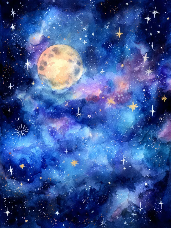 This watercolor design shows a glowing moon floating through a rich night sky filled with deep blues, indigos, and soft hints of purple. The background is layered with loose washes that blend and bloom into one another, creating a dreamy galaxy effect. Tiny stars in white and warm gold are scattered throughout, some softly splattered and others gently painted for variety. The moon sits slightly off center, glowing with warm creamy tones that contrast beautifully against the darker sky and give the whole piece a magical, storybook feel.