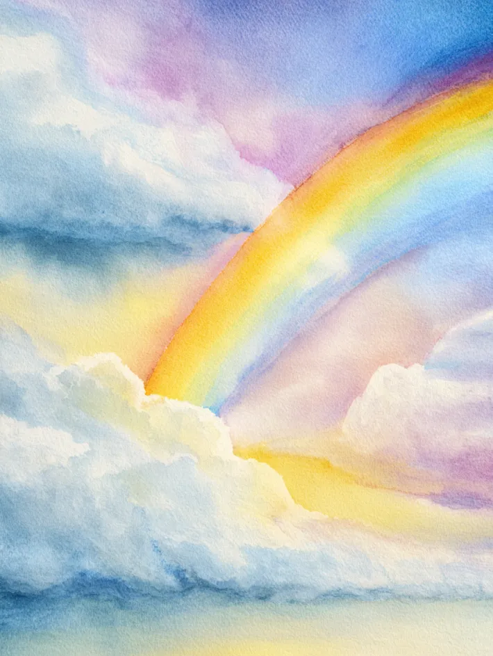 This watercolor design features a glowing rainbow sweeping gently across fluffy clouds in soft blues, creamy whites, warm yellows, and hints of blush and lavender. The brush strokes are smooth and airy, letting the colors blend seamlessly into one another without harsh edges. The rainbow curves naturally through the center of the composition, creating a peaceful flow that guides the eye from one side of the painting to the other. The background stays light and dreamy, giving the whole piece a calm and uplifting feel.