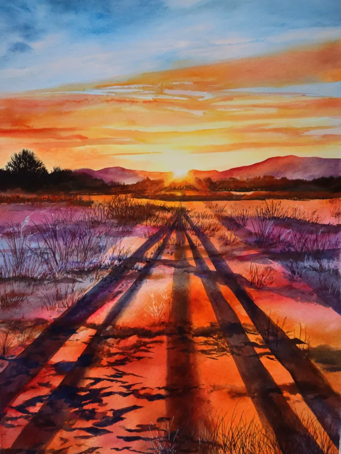 I love this kind of painting because it looks impressive while still being surprisingly forgiving to paint. Playing with long shadows is oddly relaxing, and you do not need perfect details for it to work. I find it especially soothing to layer warm sunset colors and let them blend naturally on the paper. It feels like one of those paintings where you can slow down, enjoy the process, and end up with something that feels peaceful and quietly powerful at the same time.
