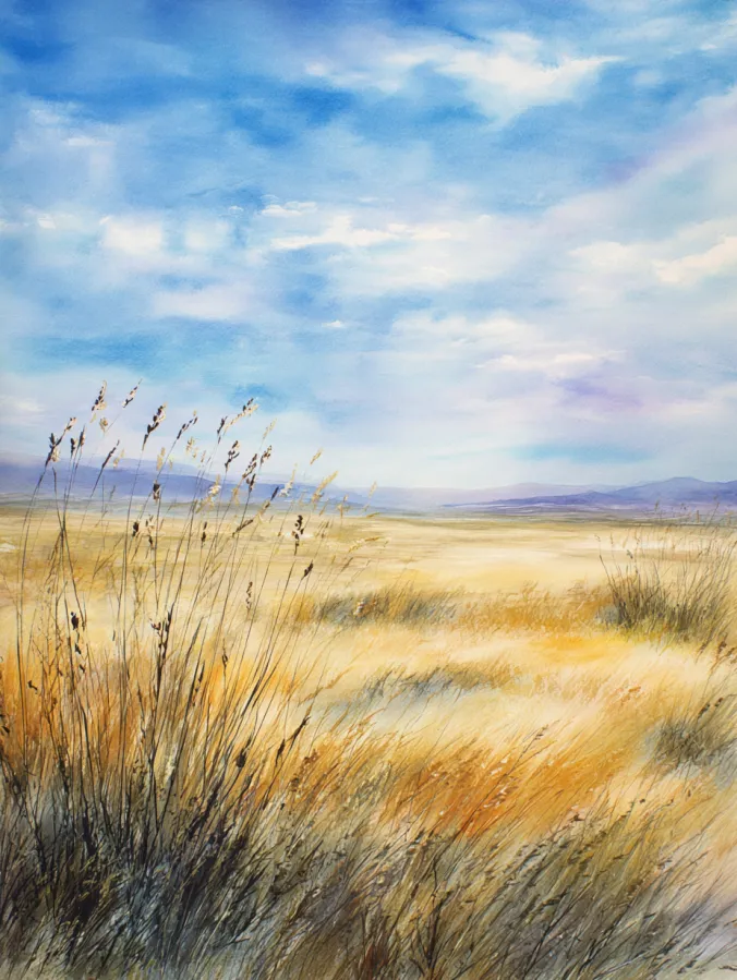 This watercolor painting captures a wide open grassland gently swaying under a soft blue sky. Warm golden yellows and light browns fill the field, with loose strokes suggesting tall grasses bending in the wind. The sky is painted in airy washes of blue and white, with subtle cloud shapes that keep everything light and open. The composition feels calm and spacious, with the grasses leading the eye toward the distant horizon and faint hills in the background.