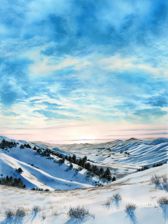 This watercolor painting shows a calm winter valley with rolling snow covered hills stretching into the distance. Soft whites and pale blues shape the land, while gentle shadows add depth without feeling heavy. The sky is painted in light airy blues with hints of warmth near the horizon, creating a peaceful glow that balances the cool landscape. Brush strokes stay smooth and fluid, especially in the snow where subtle texture keeps everything feeling soft and serene. The composition feels open and spacious, drawing the eye calmly toward the center of the valley.